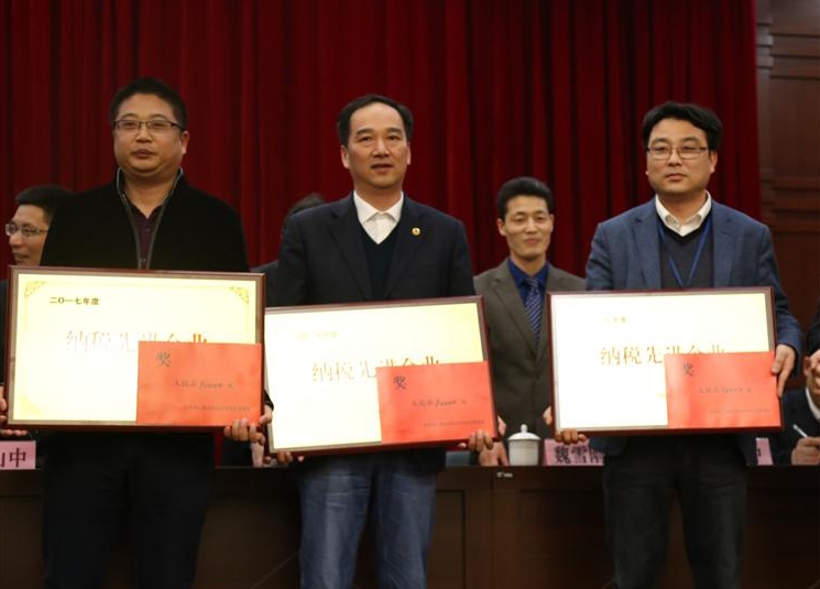 閏土新材料公司董事長周杰文、迪邦公司總經(jīng)理陳曉棟分別領(lǐng)取“納稅先進(jìn)企業(yè)”獎項